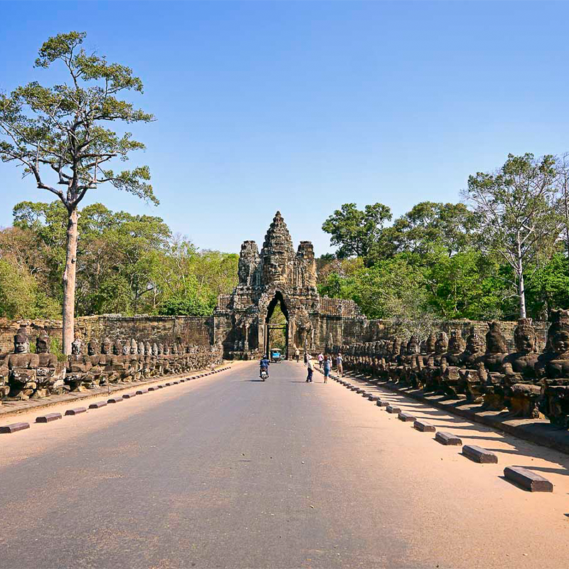 The South Gate of Angkor Thom: walk through a narrow alley guarded by 108 statues of smiling gods and fierce demons; the serene stone faces since the 12th century at the Bayon Temple, whose long bas-reliefs tell the spectacular story of Khmer victories over Cham warriors, then the richly decorated Terrace of the Leper King to the Terrace of the Elephants.