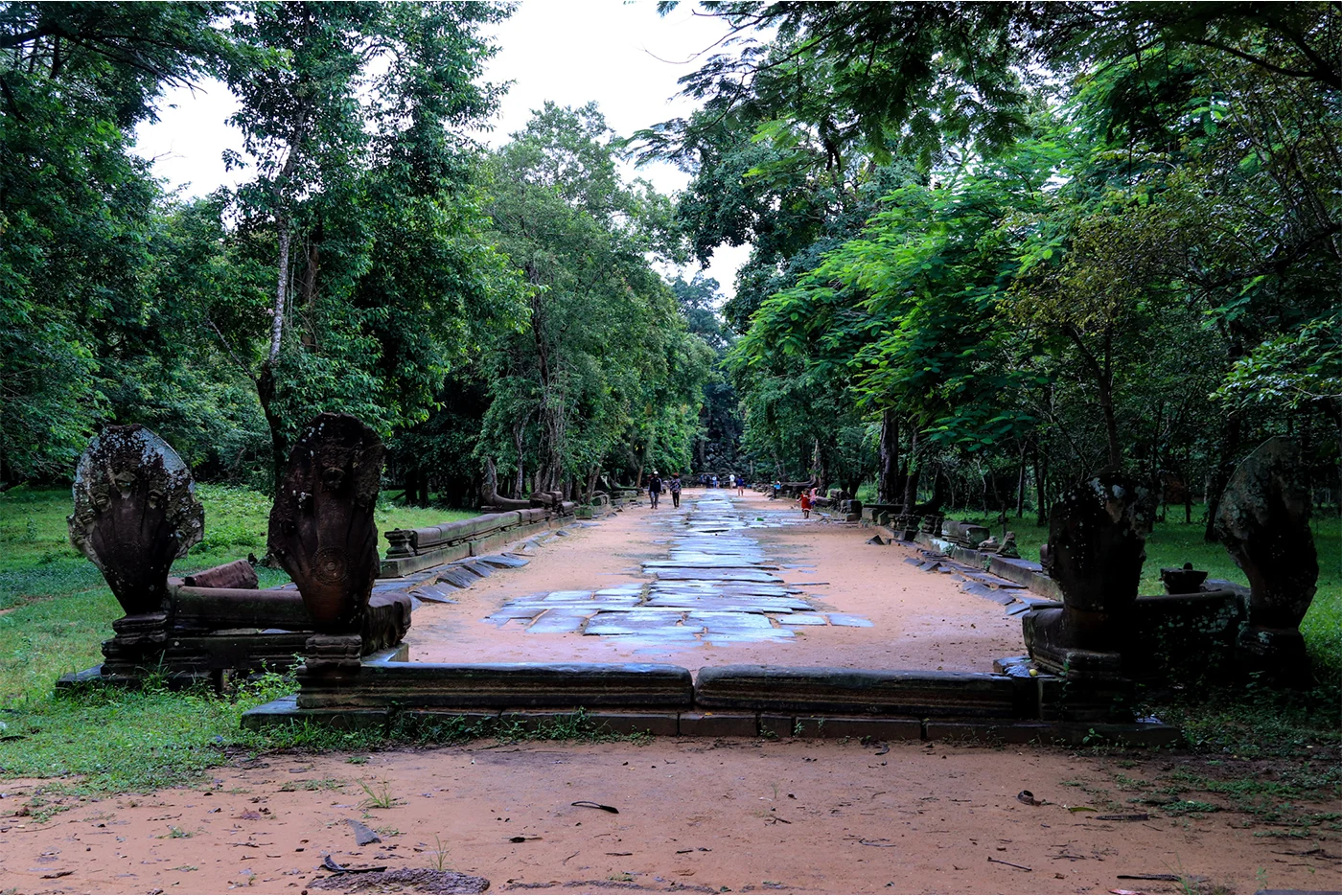 The South Gate of Angkor Thom: walk through a narrow alley guarded by 108 statues of smiling gods and fierce demons; the serene stone faces since the 12th century at the Bayon Temple, whose long bas-reliefs tell the spectacular story of Khmer victories over Cham warriors, then the richly decorated Terrace of the Leper King to the Terrace of the Elephants.