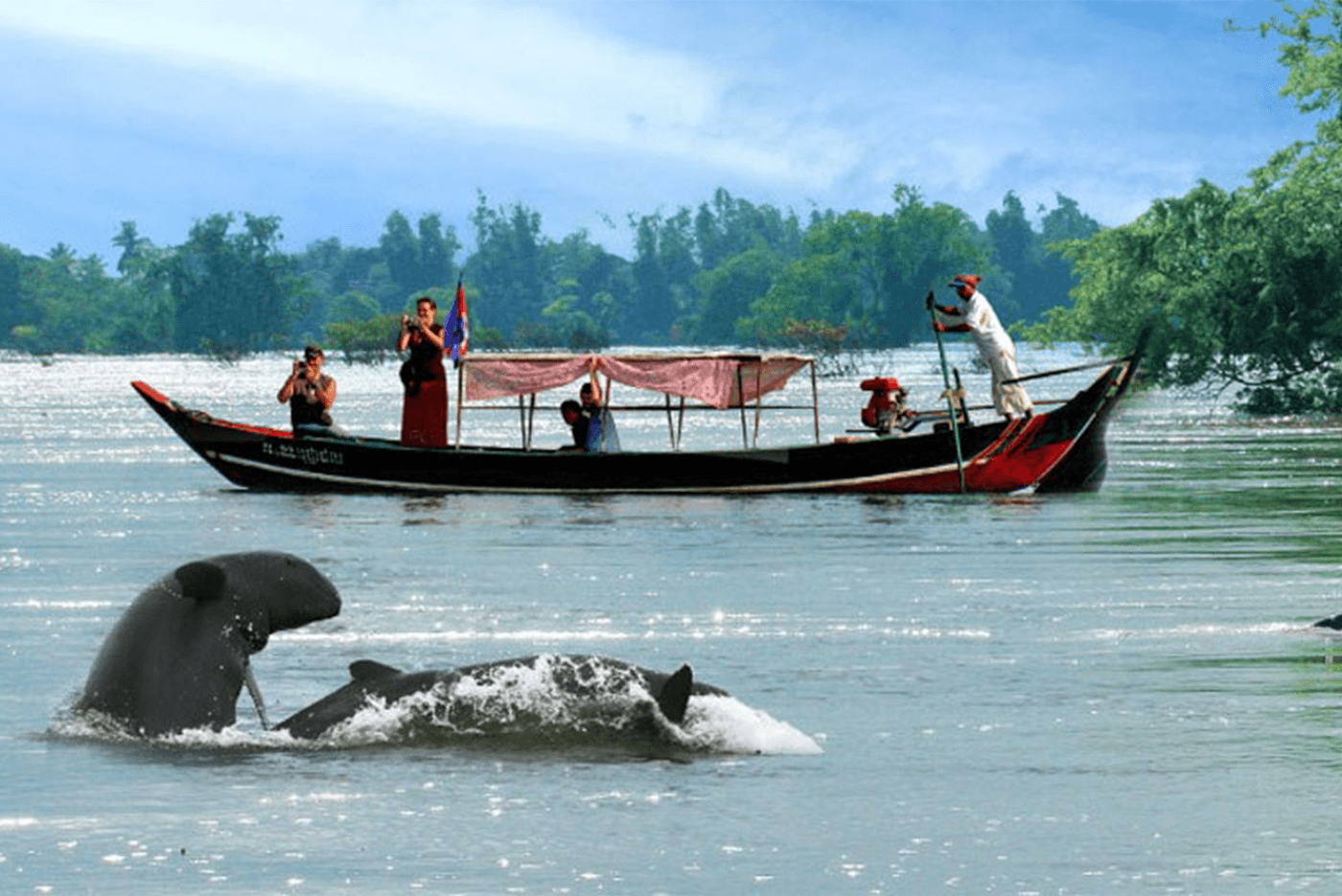 Continue to Kampi. Favorite place for observing the famous freshwater dolphins: the Irrawaddy dolphins. You board a wooden boat to sail on the Mekong and maybe you will be lucky enough to see some. Night in Koh Trong.