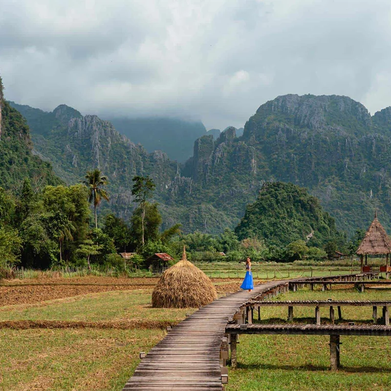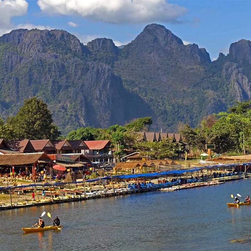After breakfast, depart for Vang Vieng, a scenic drive through breathtaking landscapes. En route, stop at Vang Xang, an archaeological site dating back to the 11th century.