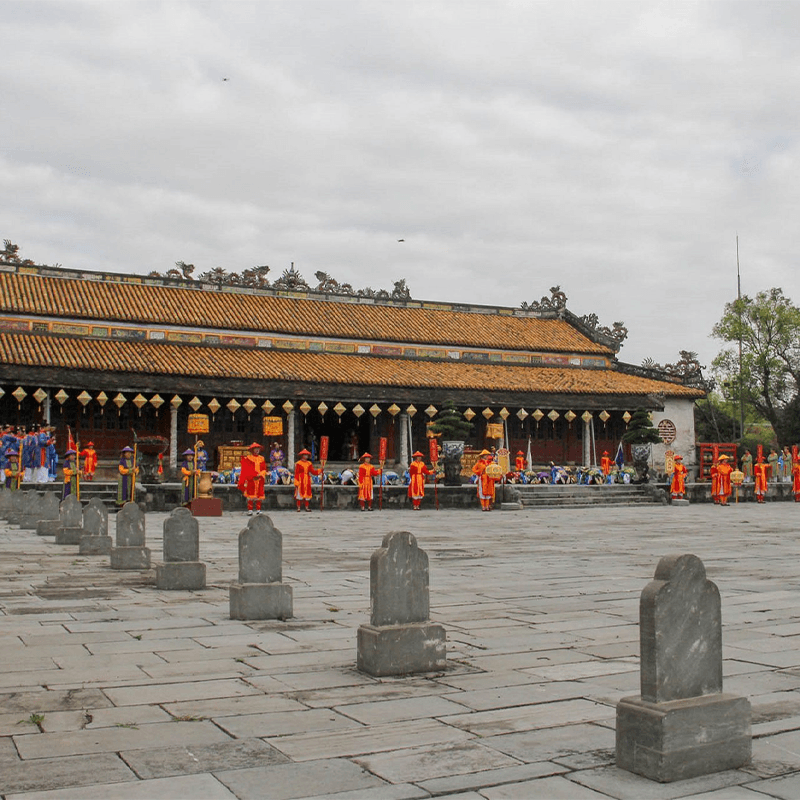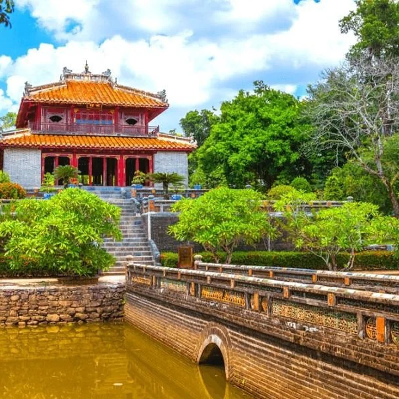 Just outside Hue, visit the Thien Mu Pagoda on the bank of the Perfume River, which was a hotbed of anti-government protest during the early 1960s. Next, visit the complex of the Tomb of Emperor Minh Mang, built in 1840, which is known for its magnificent architecture and elaborate decorations and is considered one of Hue's most beautiful pagodas. After lunch at a local restaurant, visit Tu Duc Tomb, which was built for meditation, reading and theater performances in a tranquil setting of forested hills and lakes. Your final stop is at Khai Dinh, the last monument of the Nguyen dynasty. It has a remarkably long staircase flanked by dragons, ceiling murals and ceramic frescoes. Return to your hotel on the riverbank where your Art Deco inspired rooms are reminiscent of the 1920s and 1950s. Overnight in Hue City.