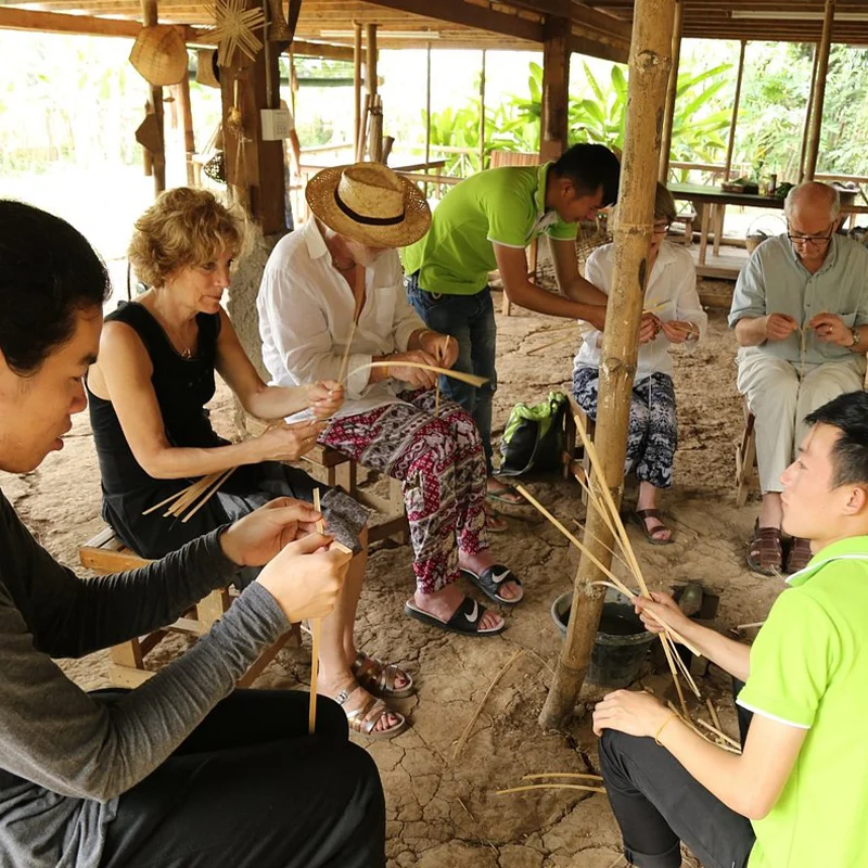 Today you will discover a little about the secret of bamboo work in Laos as well as enjoying some of the beautiful natures and rice fields surrounded just in Luang Prabang town. Begin your half day at The Bamboo Experience (Please arrive there by 8:30am) where you will meet with the rest of your group for an explanation of the bamboo works in Laos and its meaningful to Lao people. Your guide will show you the technique and/or the usage of each product as such fishing tools, music instruments etc. Start your simple bamboo weaving class with an expert (but patient!) teacher, try your hand at the knife sharpening, bamboo cutting (into pieces) and then try the traditional bamboo weaving for about one hour to complete your own mat to take home with, as a souvenir. Then, proceed to the bamboo cooking demonstration (you are free to assist) as such bamboo shoot soup, bamboo shoot steamed in banana leaf, fermented bamboo shoot dipping and sticky rice and more. Savour your creations at the end of the session in traditional Lao house (Pavilion style) overlooking the wonderful scenery and rice fields. The emphasis is to have fun and learn a little about bamboo work and bamboo dishes.